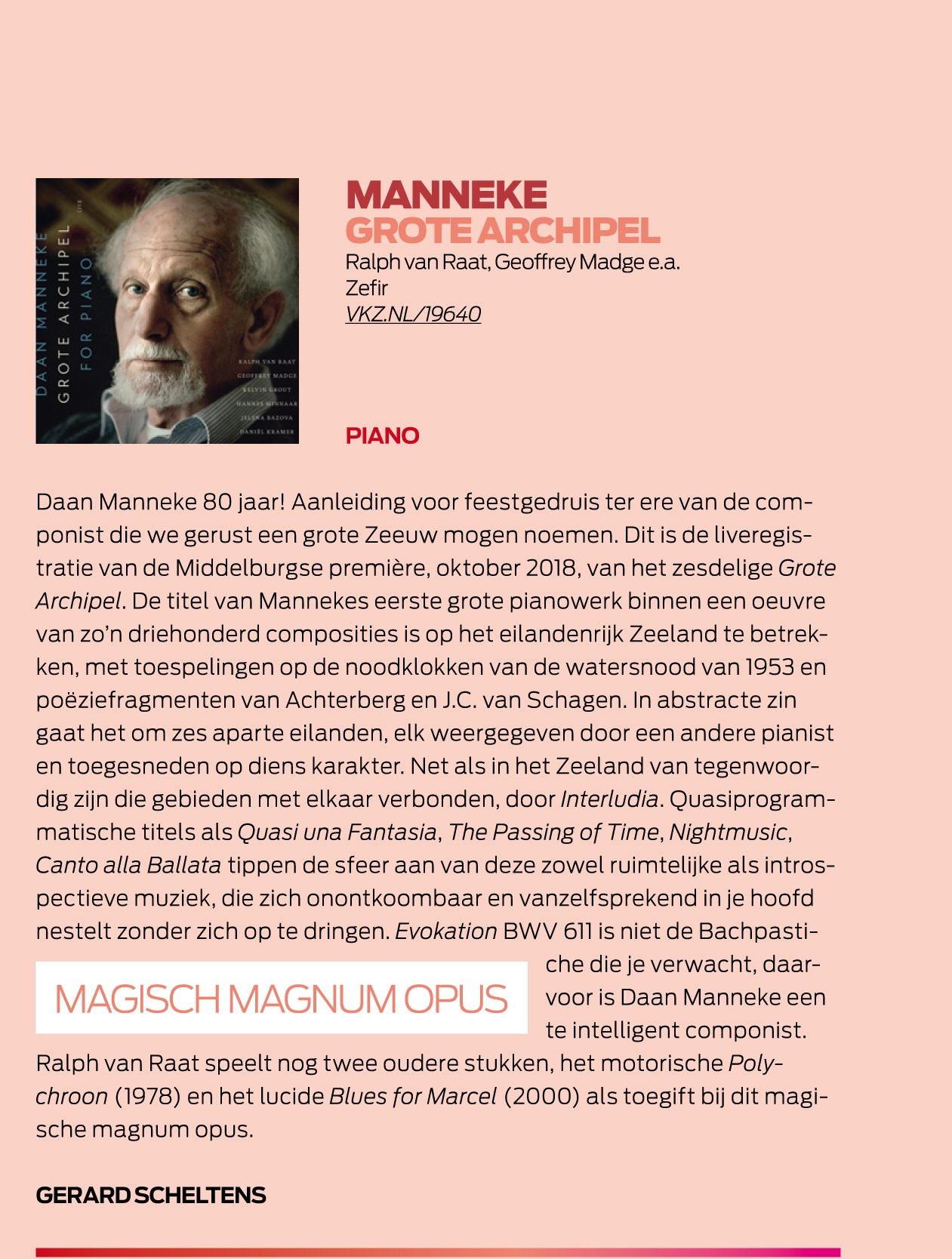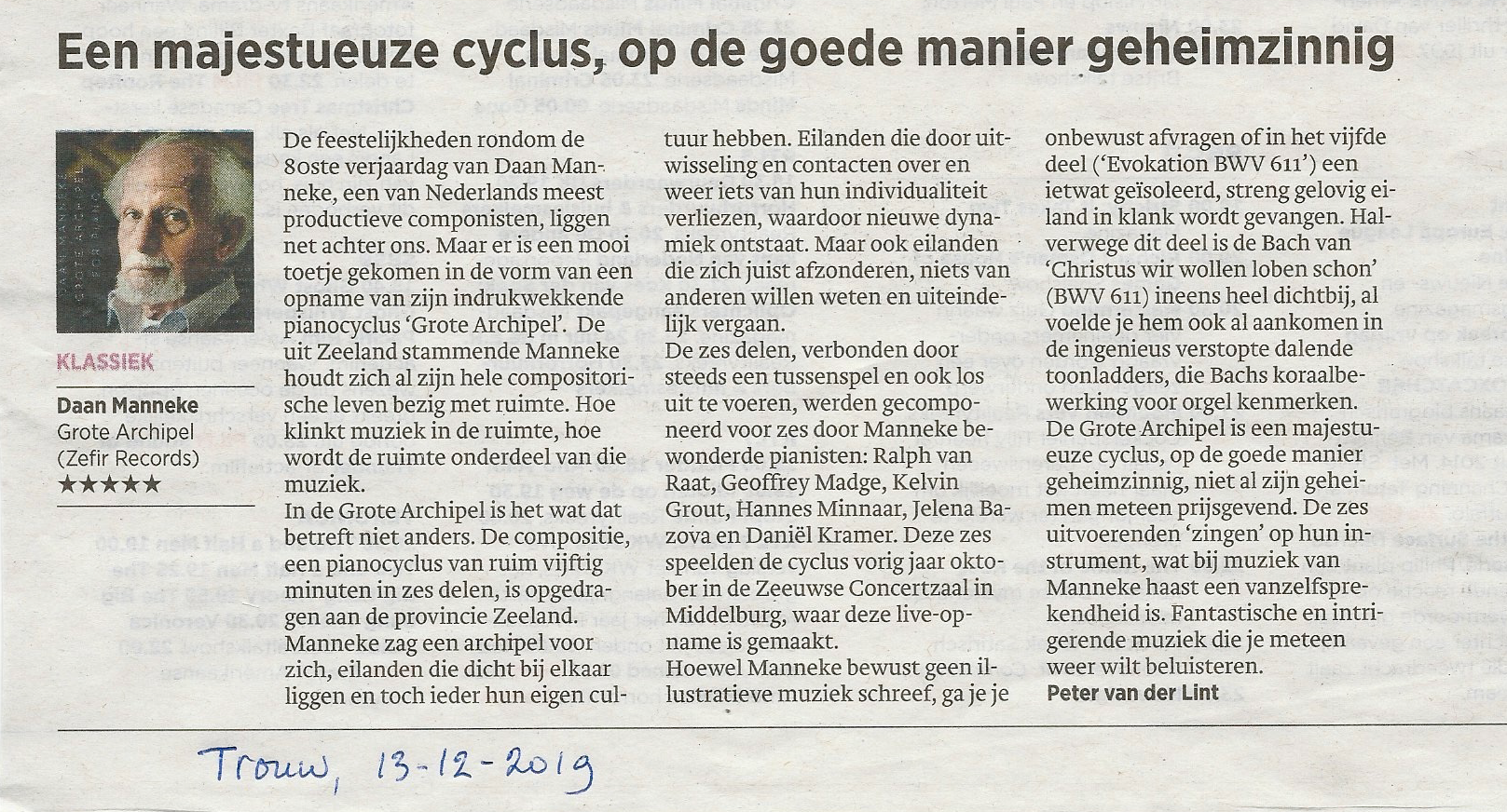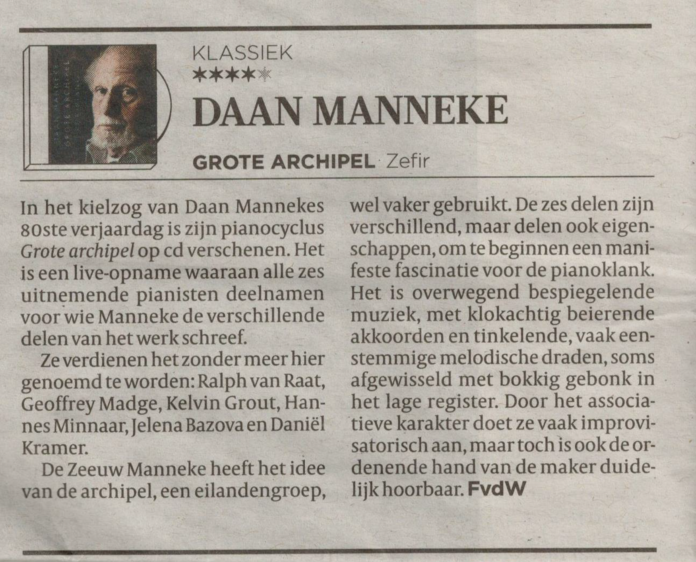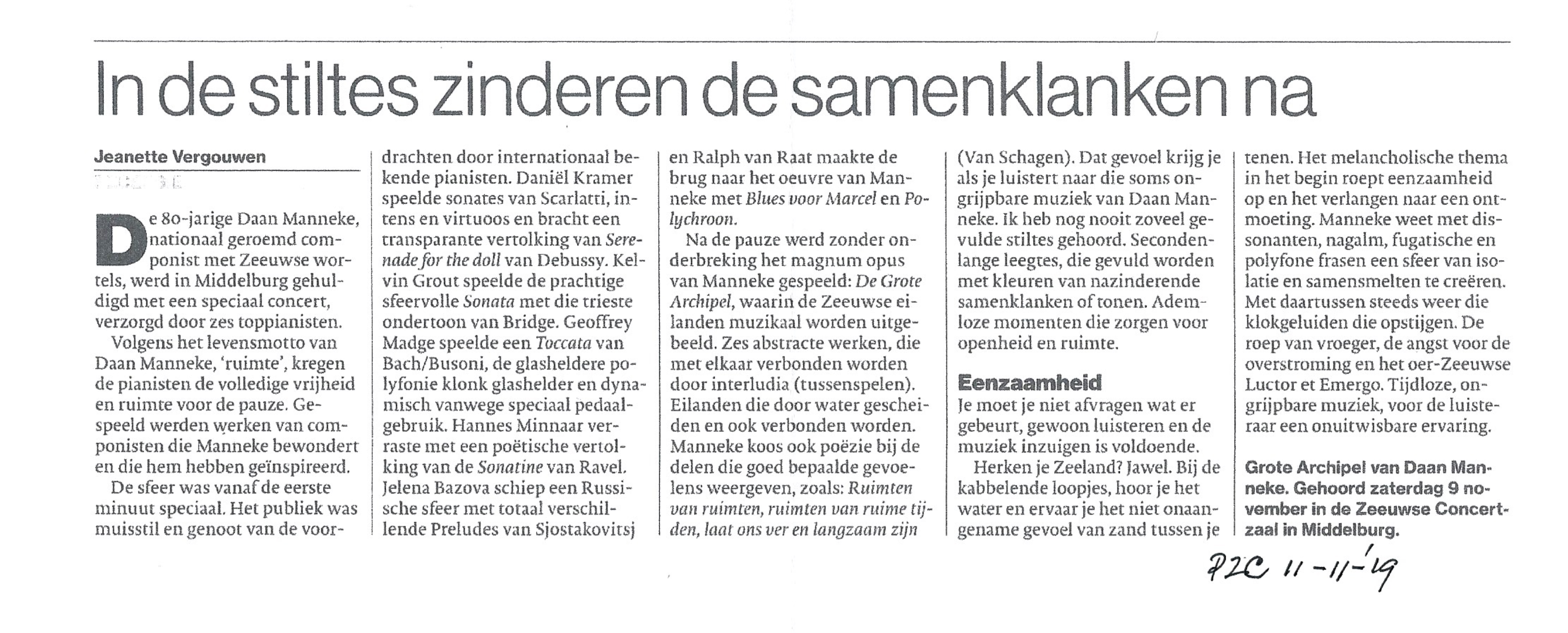 ”De 80-jarige Daan Manneke, nationaal geroemd componist met Zeeuwse wortels, werd in Middelburg gehuldigd met een speciaal concert, verzorgd door ze toppianisten. Volgens het levensmotto van Daan Manneke, 'ruimte', kregen de pianisten de volledige vrijheid en ruimte voor de pauze. Gespeeld werden werken van componisten die Manneke bewondert en die hem hebben geïnspireerd. de sfeer was vanaf de eerste minuut speciaal. Het publiek was muisstil en genoot van de voordrachten …Na de pauze werd zonder onderbreking het magnum opus van Manneke gespeeld: De Grote Archipel, waarin de Zeeuwse eilanden muzikaal worden uitgebeeld….."
