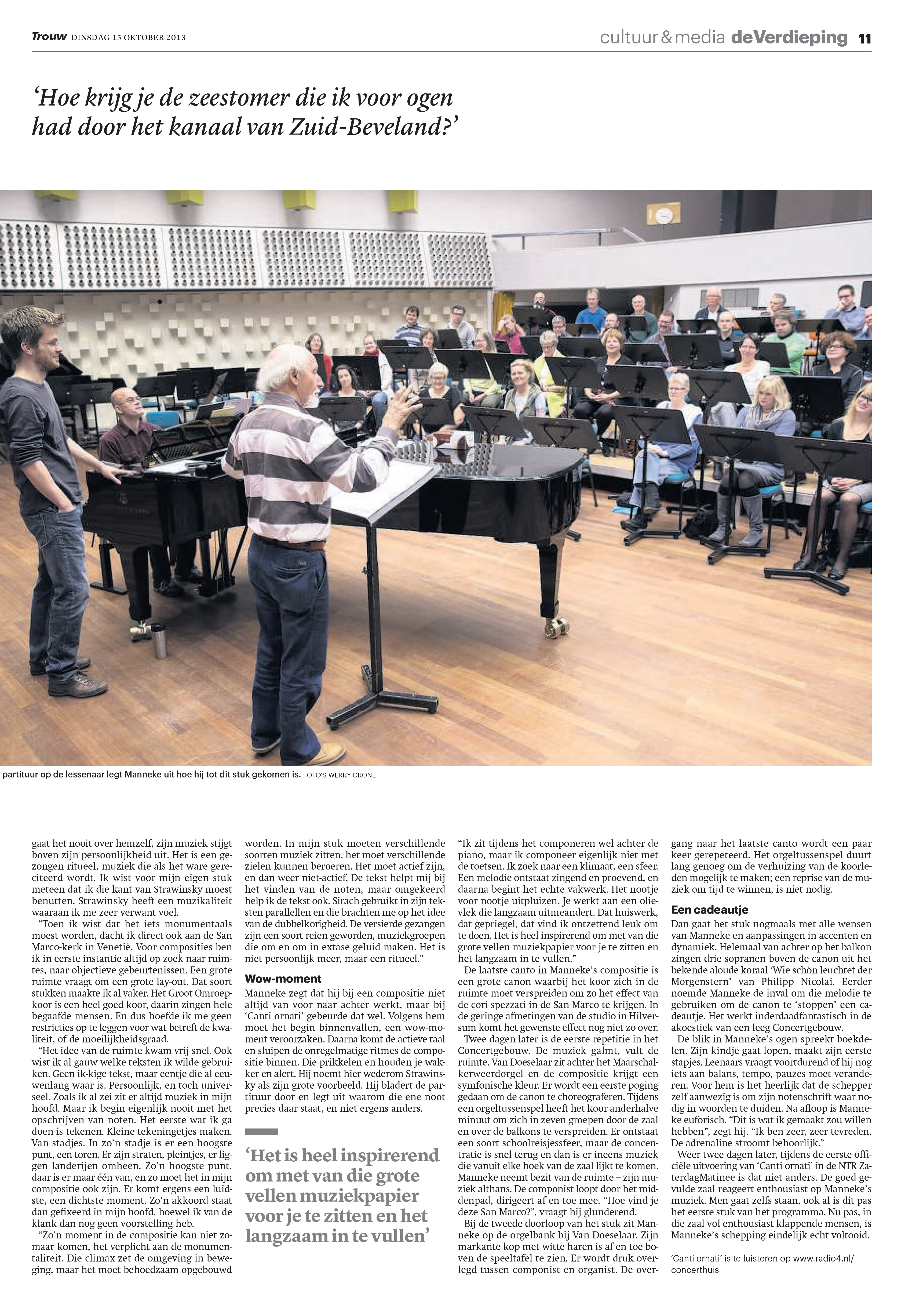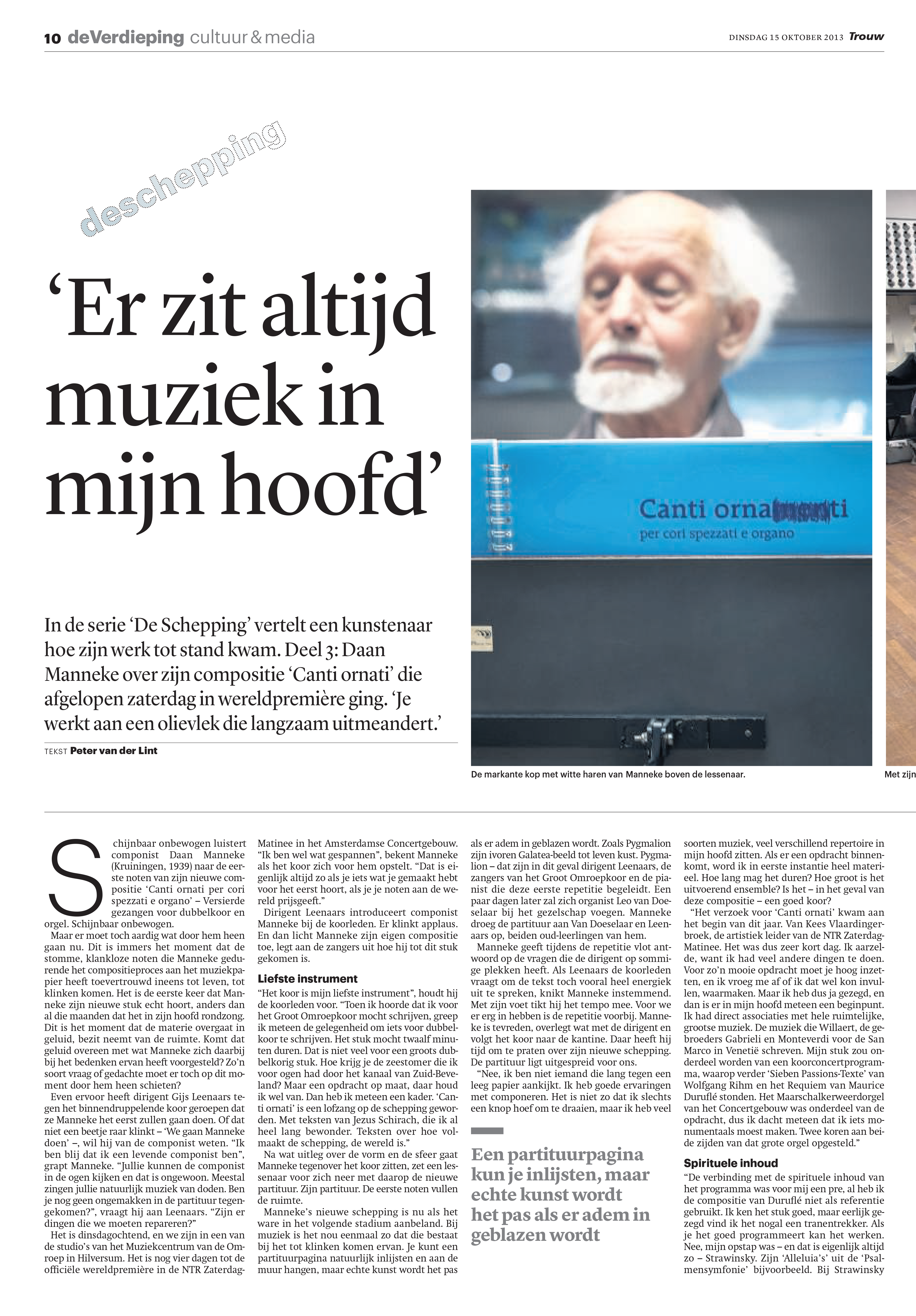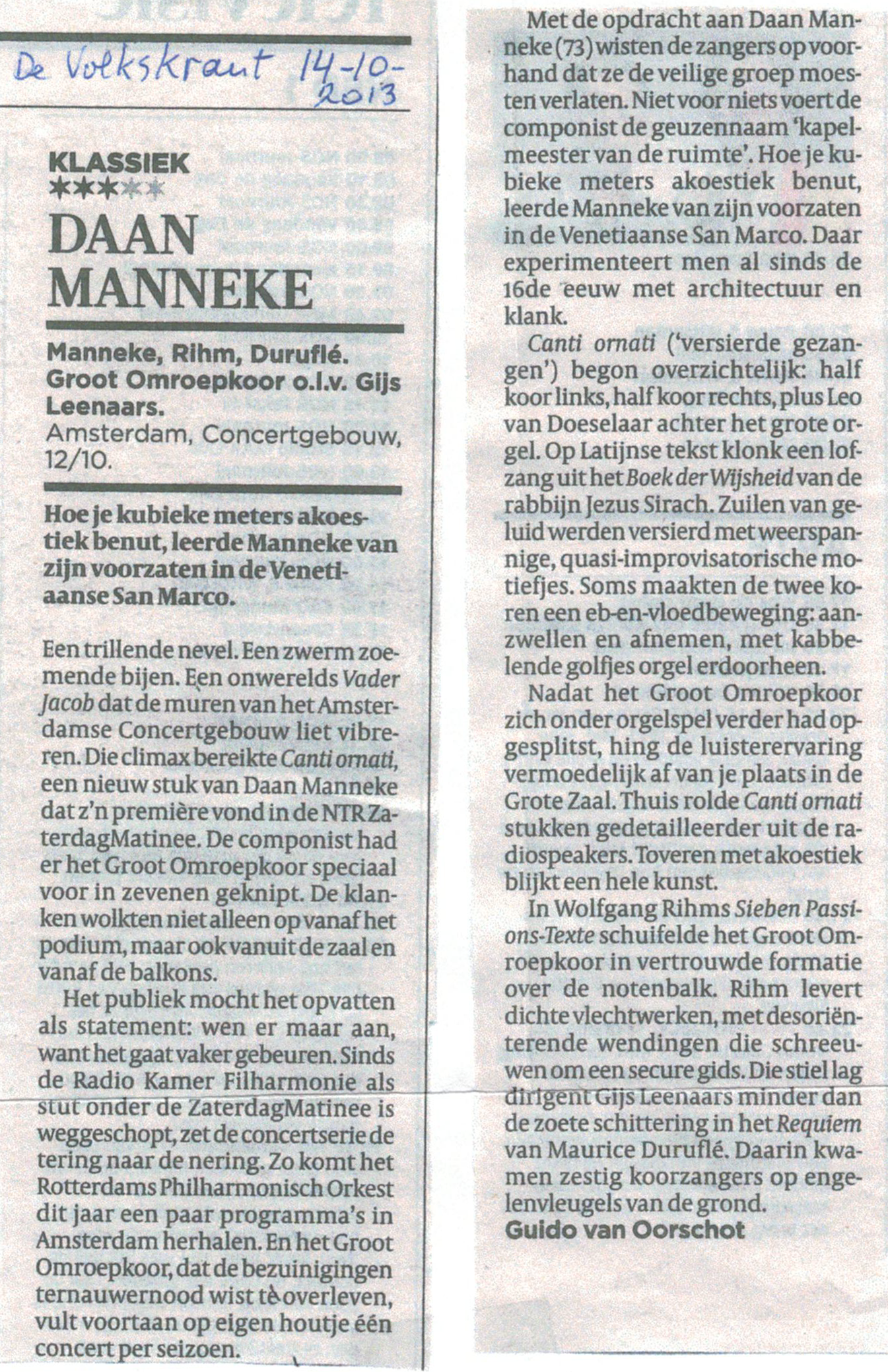 Modernere klanken horen we in ‘Spatium’ van Daan Manneke, speciaal gecomponeerd voor het heringebruiknameconcert in september 2011. Het stuk is opgedragen aan Hans Smout, de vroegere cantor-organist van de Gertrudiskerk. Manneke zegt er op zijn website het volgende over: ‘Spatium – ruimte – is een grootschalig werk dat uit zes delen bestaat. De titels van verschillende delen zijn ontleend aan een tweetal motetten van Jacob Obrecht, die van 1479 tot 1484 als koorleider aan de Gertrudiskerk verbonden was. Een bijkomstigheid: gedurende een aantal jaren – van 1959 tot 1964 – was ik als organist werkzaam aan deze Gertrudiskerk, toentertijd een Protestantse Gemeente. Ik bespeelde er het prachtige Del Haye-orgel (1771), dat tijdens de restauratie in 1972, bij een grote brand, verloren ging.’ Twee van de delen hebben het karakter van een requiem: het Confiteor is geschreven als herinnering aan het Del Haye-orgel, het ontroerende Agnus Dei is een hommage aan de in 2008 overleden Maurice Pirenne. Het verstilde ‘Amen’ aan het einde van het laatste deel (‘Omnis Spiritus laudet Dominum’) is een citaat uit het gelijknamige motet van Jacob Obrecht. In alle delen maakt Manneke – hoe kan het ook anders bij deze ‘kapelmeester van de ruimte’– optimaal gebruik van de prachtige akoestiek van de kerk. Ook andere voorliefdes van de componist zijn herkenbaar aanwezig: bourdontonen, Gregoriaans, minimal, om er slechts enkele te noemen. Toegegeven, de muziek van Manneke heeft vaak een vrij hoog abstractieniveau. Wie zich er echter voor openstelt, betreedt een fascinerende muzikale wereld die toegankelijker is dan ze wellicht in eerste instantie lijkt. Aan Janno den Engelsman ligt het in ieder geval niet, een gloedvoller pleidooi voor zijn muziek kan Daan Manneke zich nauwelijks wensen.